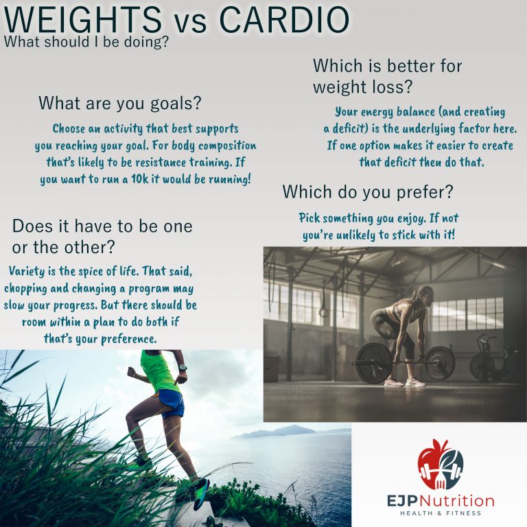 Should I start with weights or cardio? Start with whichever meets you goal. Much like within a training session if increasing your deadlift 1RM is a priority you start with that so you aren’t fatigued and can maximise that lift. It may be better to then do cardio at the end, or on a different day.